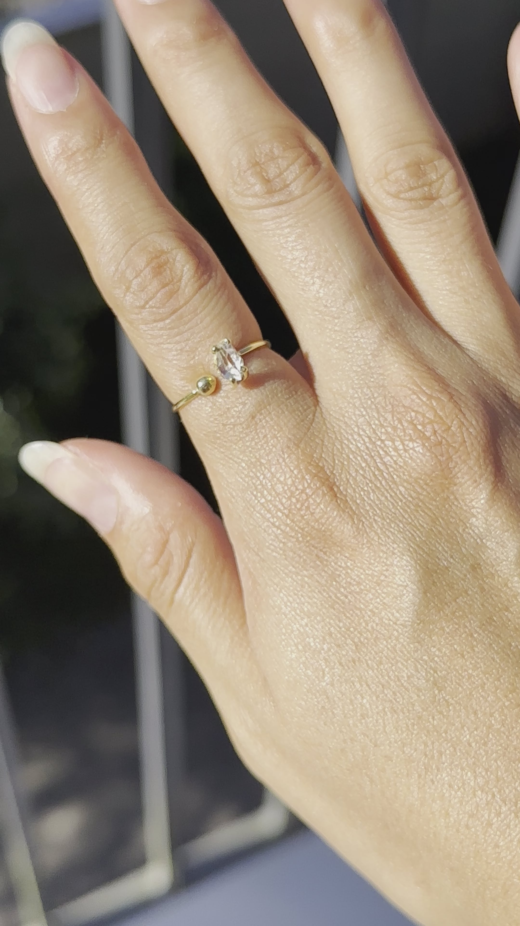 This piece was designed in Switzerland and handcrafted in Peru. Its design is modern, minimalistic, and delicate. It features a sphere shape, accompanied by a natural crystal placed next to it. What makes each ring truly special is its unique raw Herkimer stone, ensuring that no two are alike. Adorn yourself with a touch of nature’s beauty and meaningful energy.